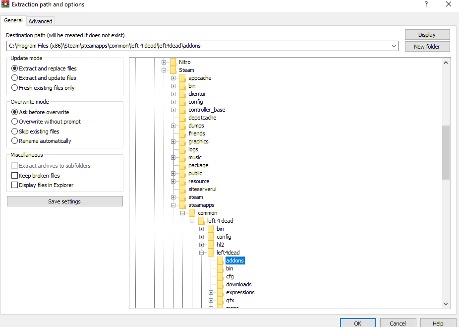 Direct your extraction to your Left4Dead addons folder. (See the image below) Your addons folder may be located somewhere else. But this is the most common location. The addons folder holds "VPK files" - this is the format of the custom maps.